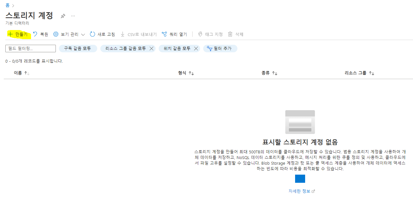 마소 애저 검색창에 스토리지 계정검색하면 아래처럼뜸