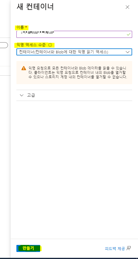 +컨테이너버튼을 누르면 아래처럼 뜨는데 내가 사용할 컨테이너 이름을 입력하고, 나는 쇼핑몰을 만들거라 익명엑세스수준은 퍼블릭으로 했음