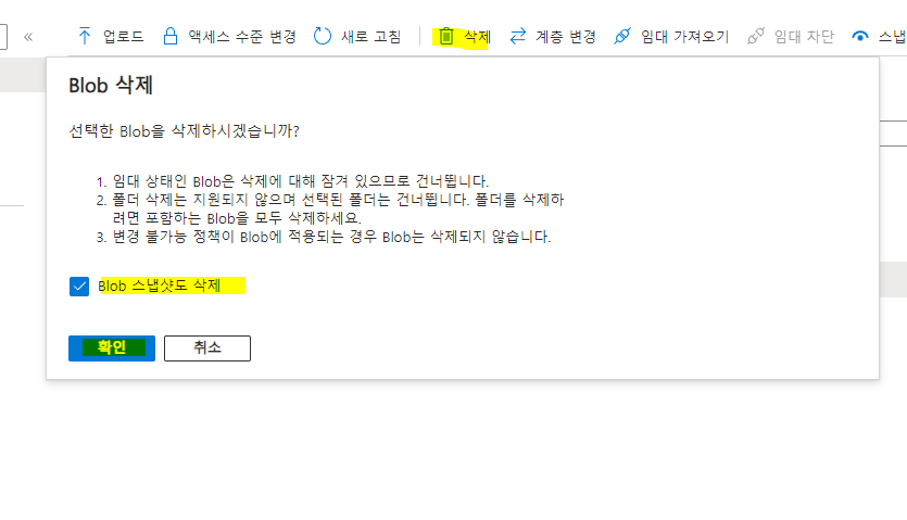 업로드된 데이터 삭제시 Blob 스냅샷도 삭제 체크후 삭제하면됨