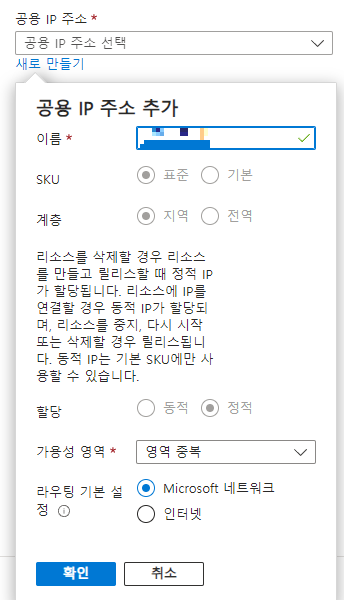 이름 작성후 공용IP주소부분에 새로만들기를 눌러서 새로 만들겠음