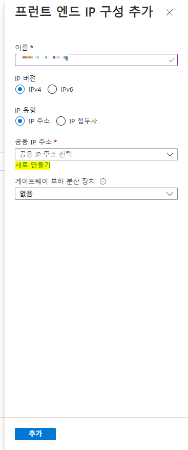 배포가 완료되면 리소스로 이동눌러서 좌측에 프런트엔드 IP구성을 누르면 내가만든 프런트엔드 IP주소도 볼수있음