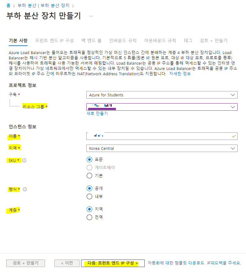 부하분산옵션을 Azure Load Balancer 로 선택후