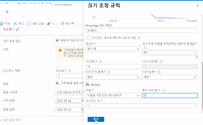 - 크기 조정 정책 : 일단 수동으로 설정후 배포후에 확장중탭 들어가서 자동으로 바꿀수도있음