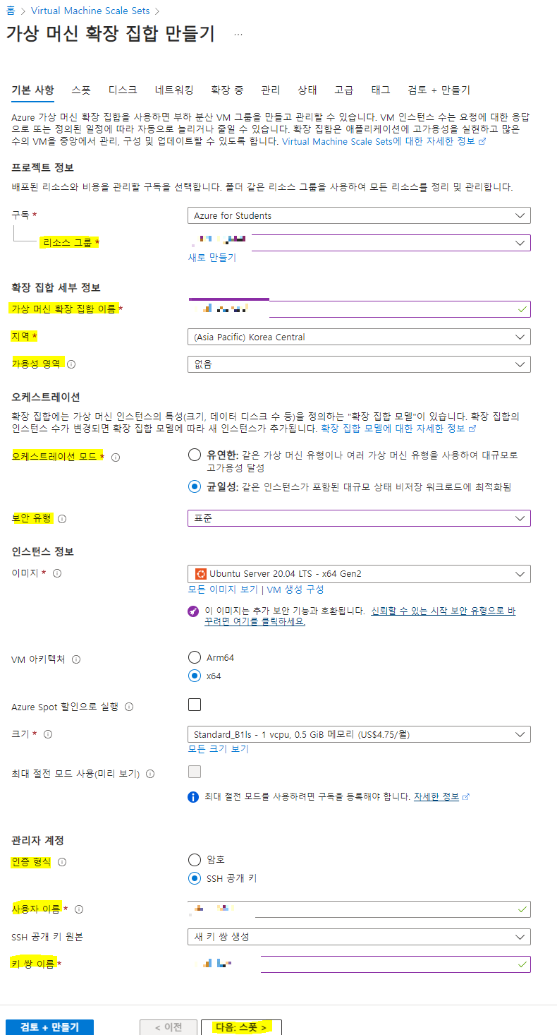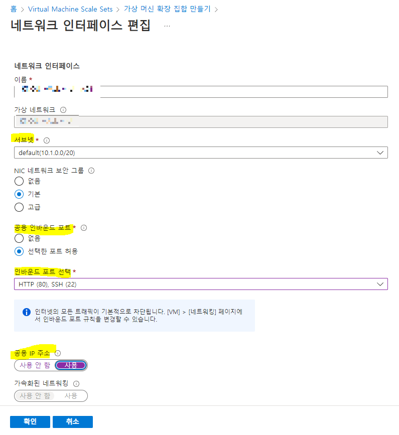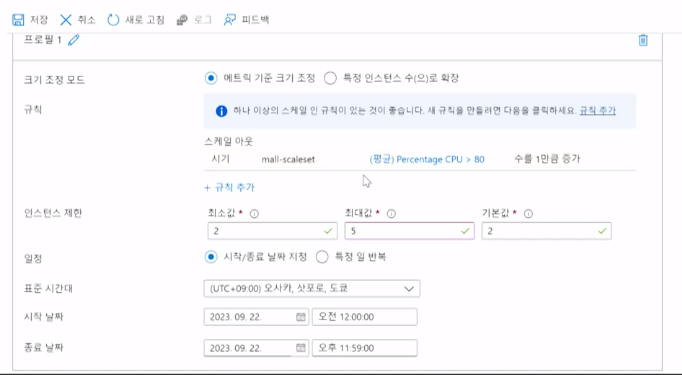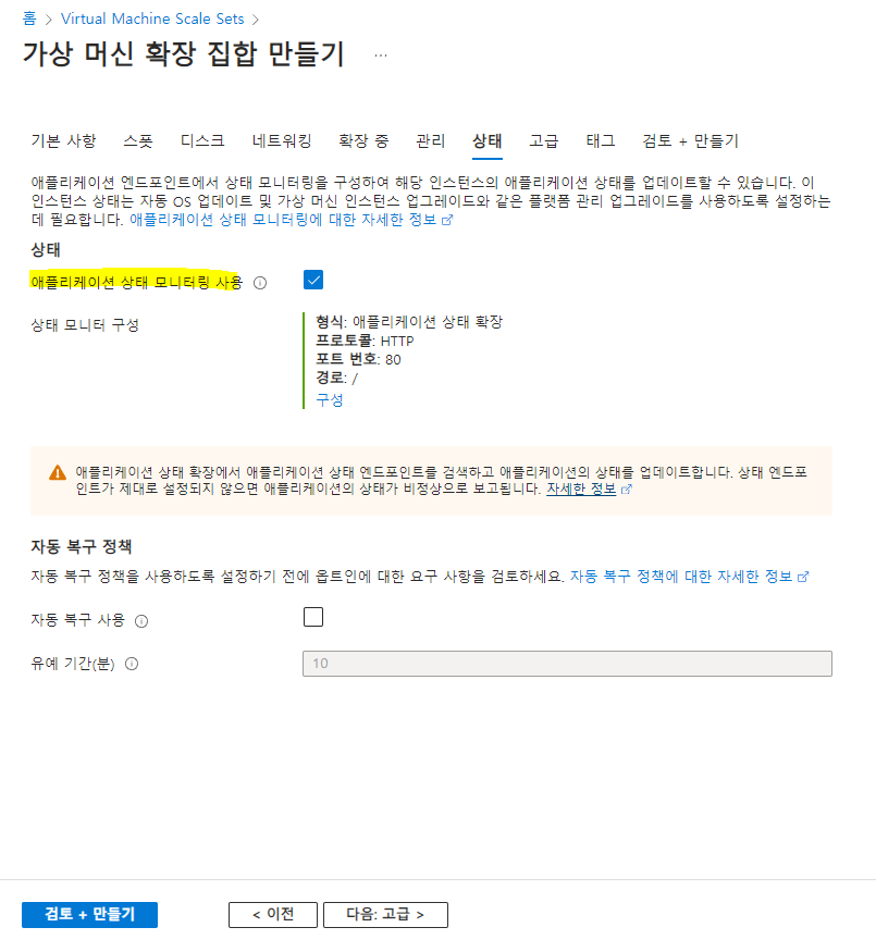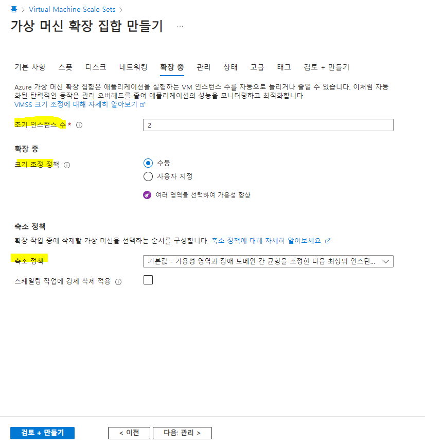 - 초기 인스턴스 수 : 가상머신확장집합의 백엔드풀로서 몇개의 가상머신이 최소한있어야하는지