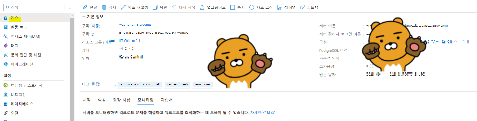 내가만든 애저 db에서 개요탭을 들어갔을때 뜨는 오른쪽 정보를
