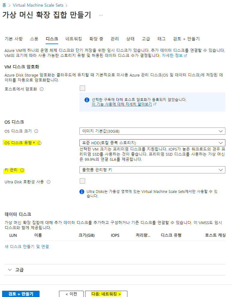 디스트유형은 표준HDD 설정후(과금때문에 ㅋㅋㅋ), 키관리는 플랫폼 관리형 키로 설정후 다음을 클릭한다