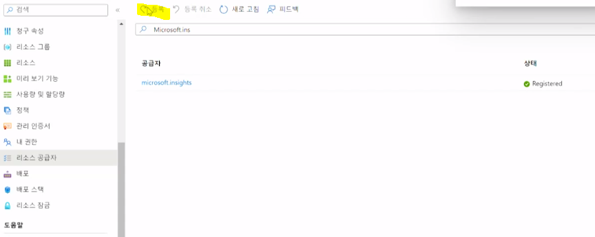 구독 - 리소스 공급자 - microsoft insights 가등록되어있는지 확인