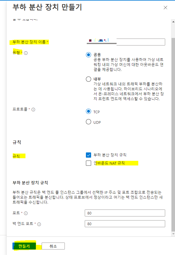 설정후, 부하분산옵션을 만들기위해 Azure Load Balancer선택후
