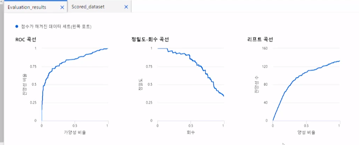 알고리즘(Two class)을 배치시키고, Train 모델로 훈련시키고, 남겨놓았던 70퍼센트의 데이터가 Train 모델에 입력되고, score모델로 수치화시키고, 이걸 검증할 검증데이터도 Dataset에 같이넣어주고, 그 결과를 Evaluate모델에 넣어주면 최종적으로 시각화까지해서 전반적으로 어떤식의 성능을 하는지 파악가능함