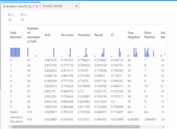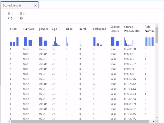 Cross Validate Model 블록위에서 우클릭 - 데이터 미리보기 - Scored results 를 보면 아래같은화면이 나온다