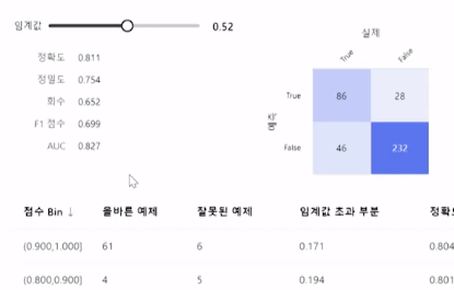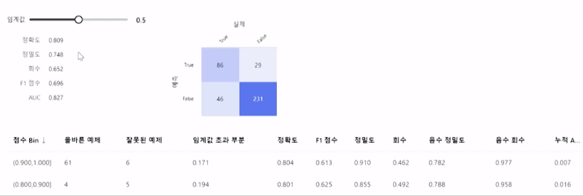 0.5이상은 생존(true), 미만이면 사망(false)으로 판단해서 Scored Lables 에 나타내는데