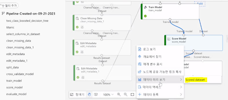 일단 Score Model에서 우클릭-데이터미리보기-Scored dataset눌러서 보면