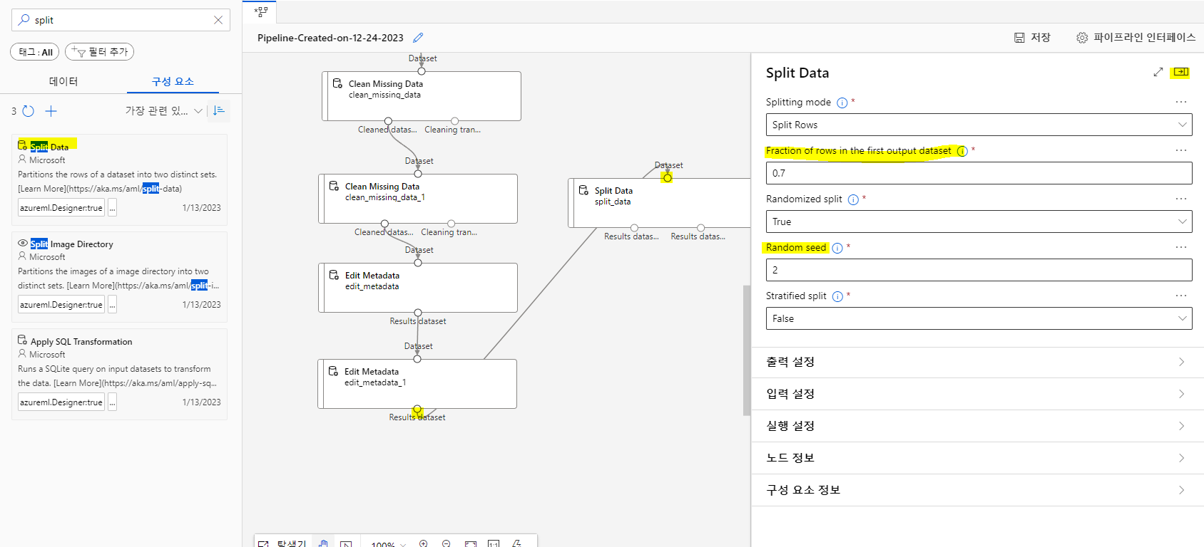 훈련데이터와 검증데이터 분리를 위해 split data블럭을 만들것임