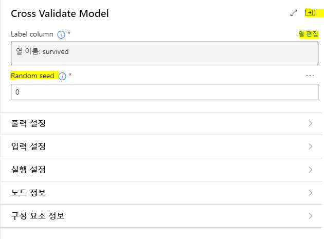 Cross Validate Model블록을 더블클릭해서 열편집- 열이름을 survived로 입력후 저장한다