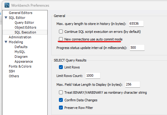 MySQL Workbench 상단 메뉴의 Edit - Preferences - SQL Editor 내의 SQL Execution - General 칸의 New connections use auto commit mode를 체크해제하면 항상 오토커밋을 끌수있음