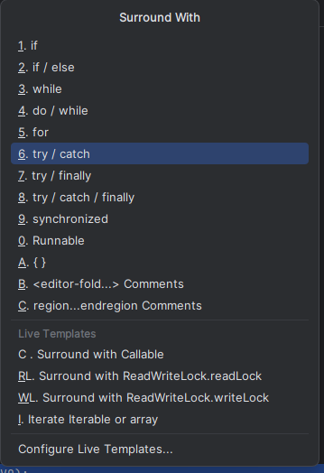 해당 단축키를 쓰면 빠르고 손쉽게 try catch문을 작성할수있음