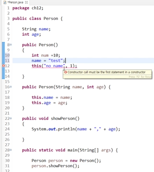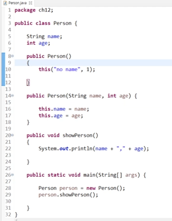 - Person생성자에서 디폴트 값을 no name, 1로 설정하는 생성자를 만들때