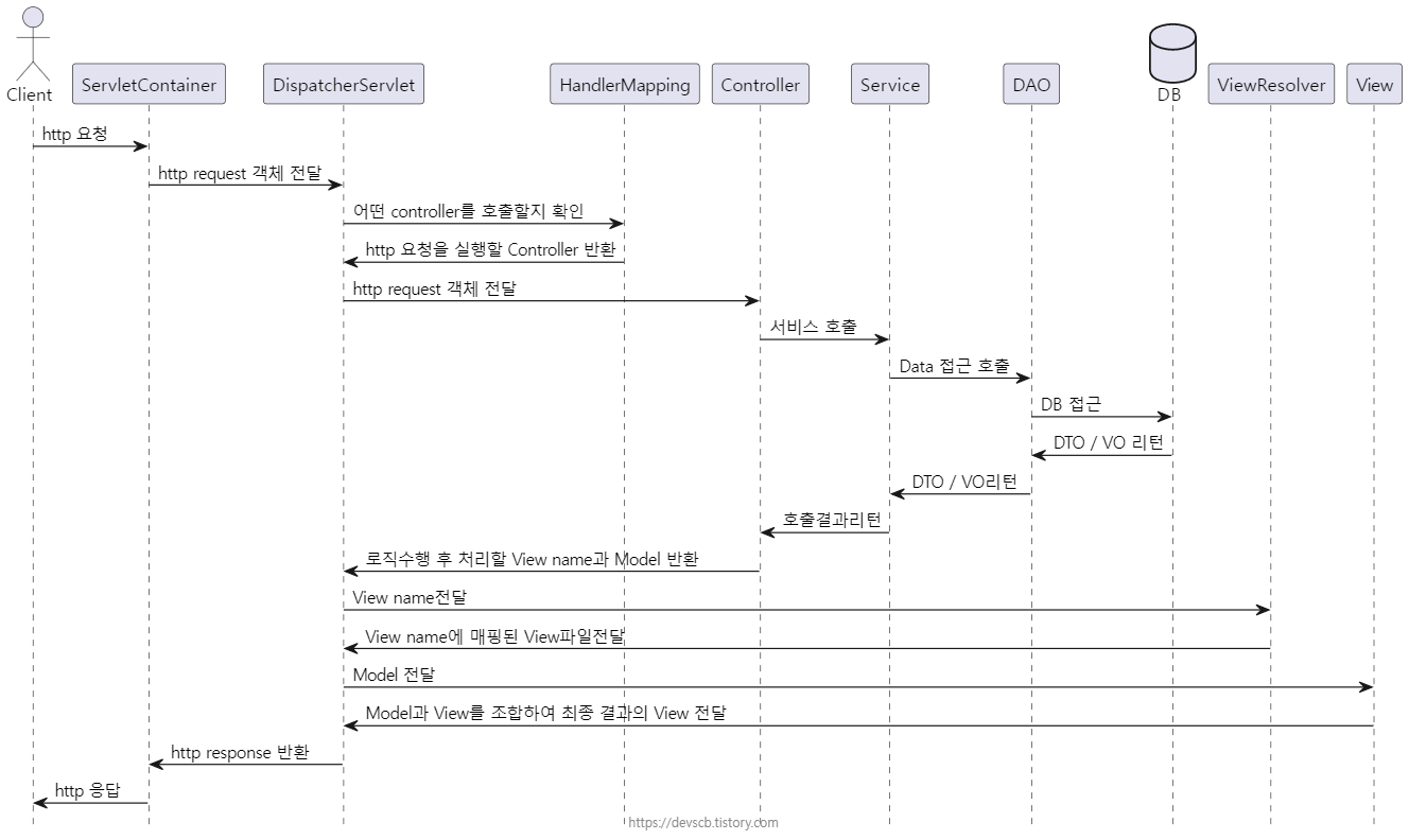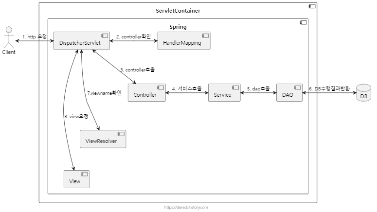 8. DAO -> Service -> Controller로 결과를 리턴받게 되고, Controller는 Viewname과 Model을 리턴합니다.