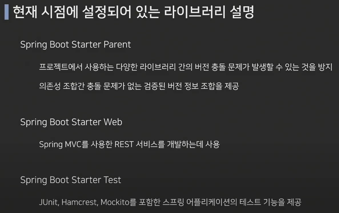 * Spring Boot Starter Web 은 다양한 라이브러리가 정리되어있는 라이브러리라고 볼수있음, 일일이 디펜던시에 의존성설정안해도되게 꾸러미 제공