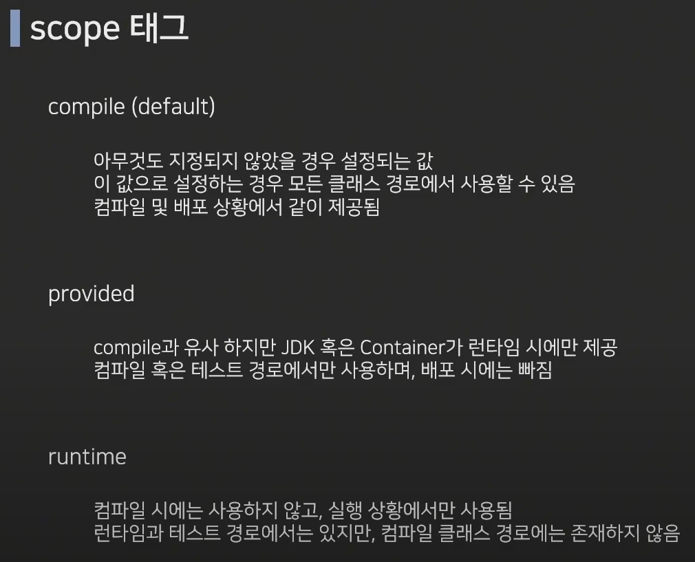 * system은 잘안씀(레퍼지토리에서 관리X, 직접관리하는 jar파일을 디펜던시로 잡아야함)