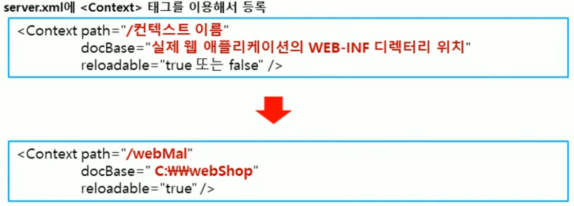 * server.xml에 <Context> 태그를 이용해서 등록